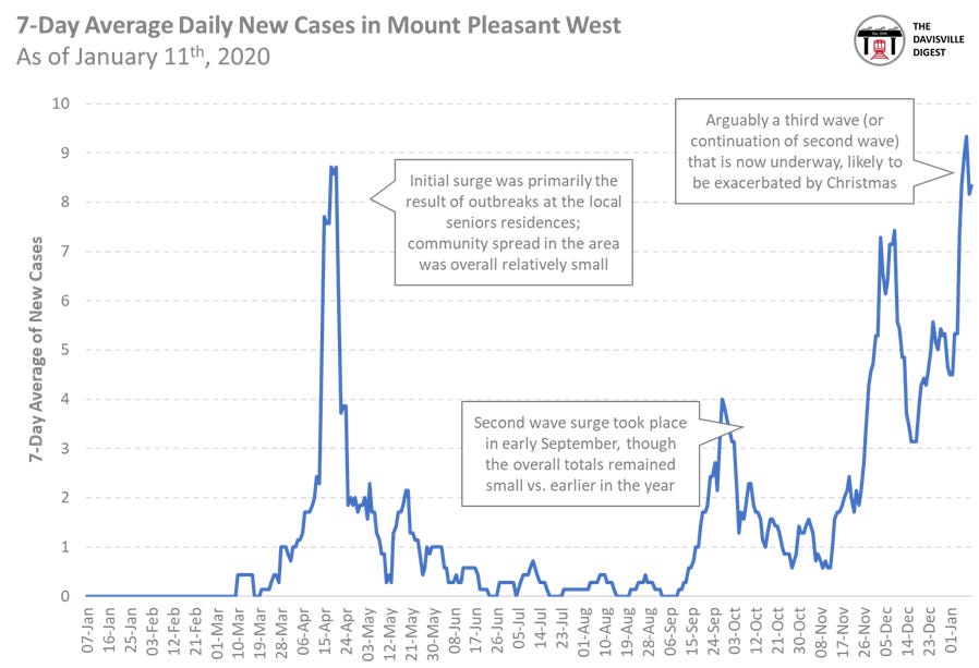 It took about a week but, like the rest of the City, Davisville is now seeing its own surge in COVID-19 cases post holidays. The numbers are still relatively small for a neighbourhood of almost 30,000 residents, but they’re now on-par with the surge seen in the first wave when there were large outbreaks at local care homes. Not great!