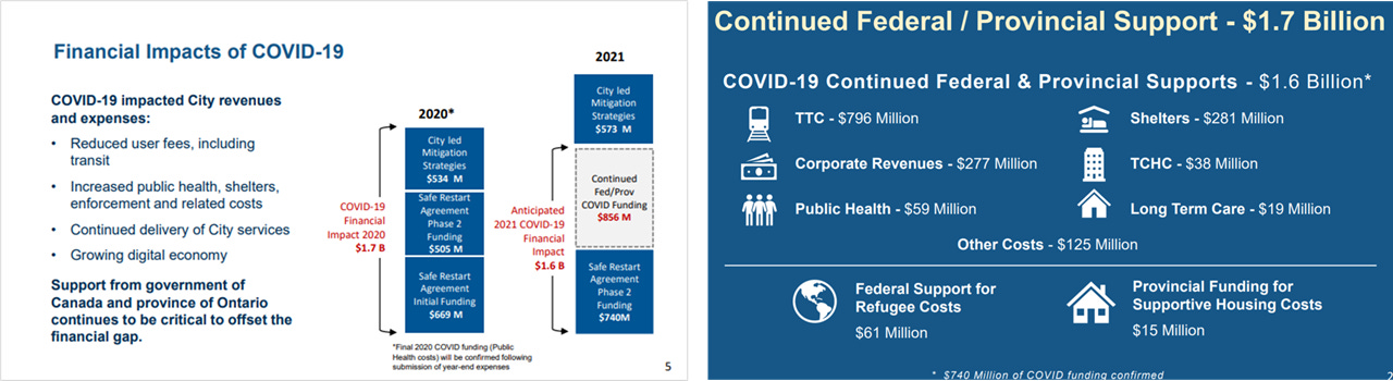 Regardless of how the important debates above play out, ultimately it will all be for not if one key question is not addressed: will the Provincial and Federal governments continue to step in to fund Toronto’s budgetary shortfall? Specifically, while they have already committed around $740 million, the City says they will need an additional $850 million. Otherwise, it will need to divert a huge portion of its capital spending - an area where the City already spends too little - to fund the deficit.