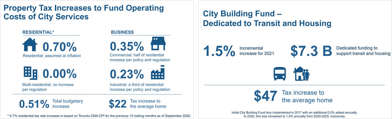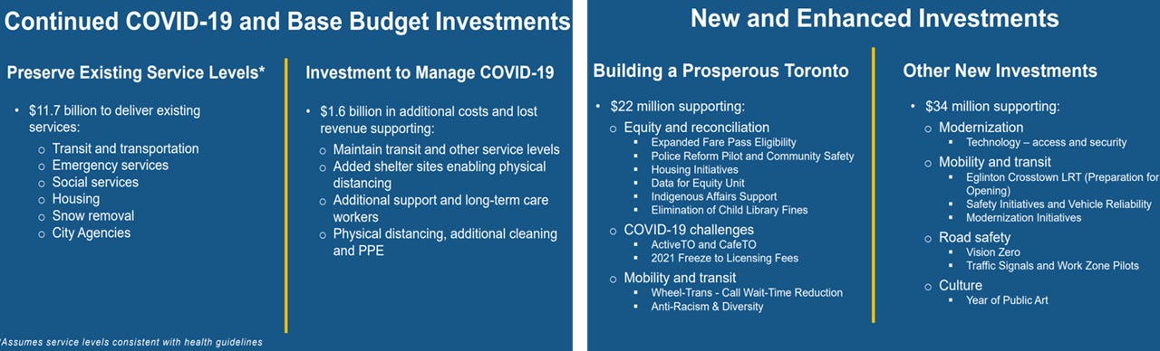 City Services - City Hall has been stating for months its intent to “build back better” after COVID-19. Based on the budget though, the plan should probably be renamed to “build back kinda the same”. Outside of the areas directly impacted by COVID-19 - such as public health, senior care, and the shelter system - and some funding on topics like diversity & inclusion, the budget’s focus is mostly on maintaining existing pre-pandemic service levels (i.e., # of recreation programs, or hours of operation for facilities) rather than investing to expand them to address capacity issues that predate the pandemic. Expect many of the advocacy groups to push councillors and staff on this point.