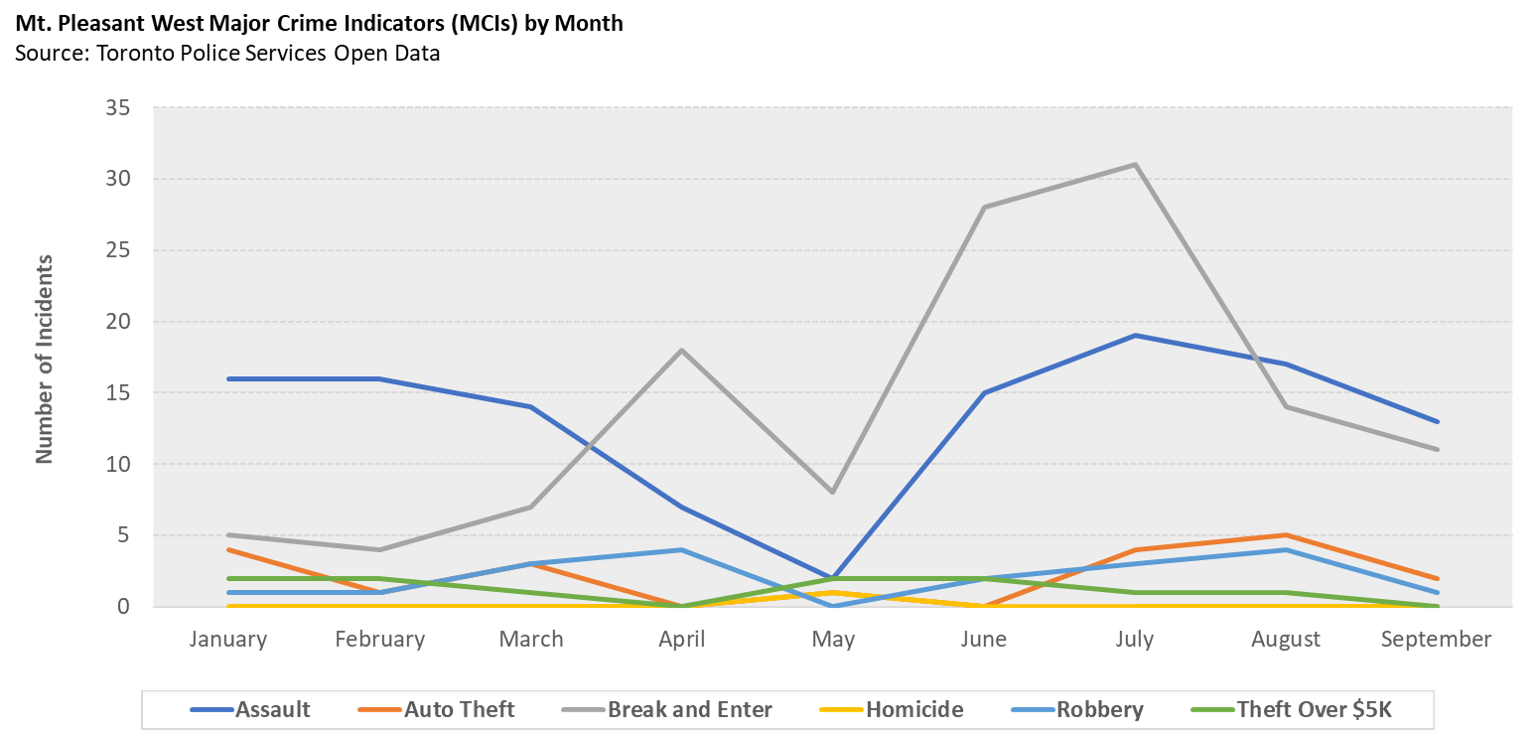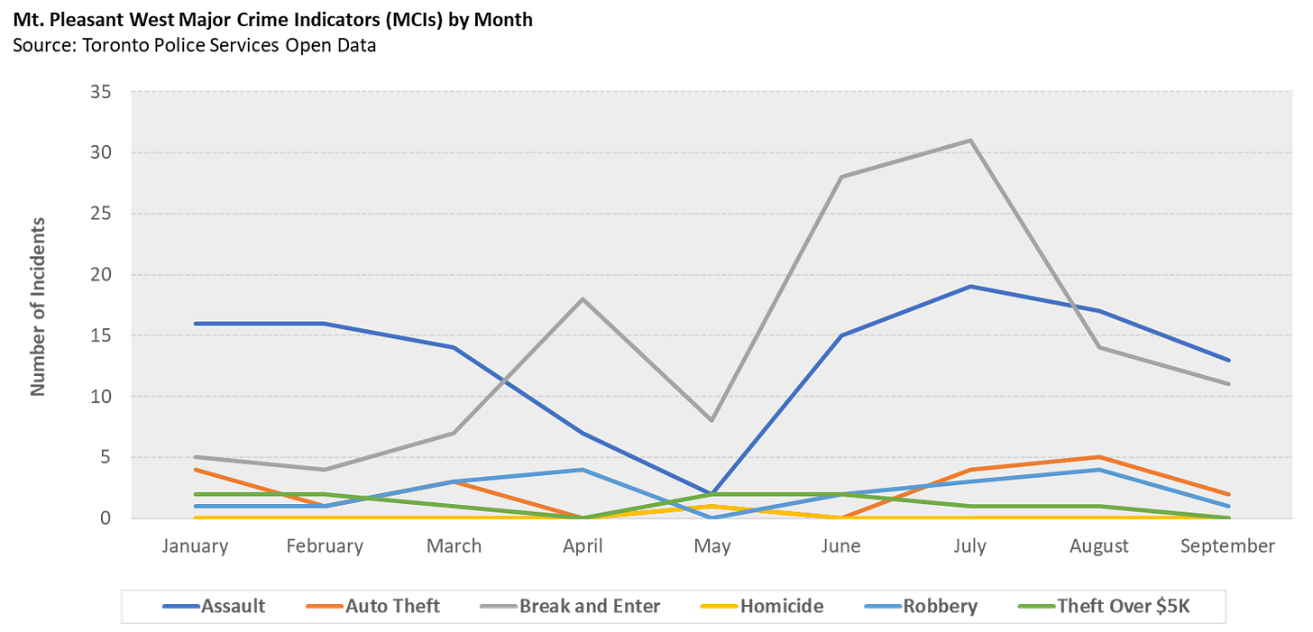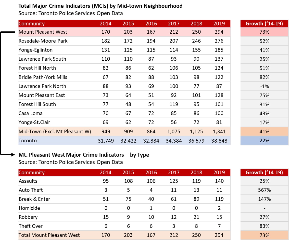 But crime is undoubtedly going up (see below). Between 2014 and 2019, the number of MCIs in Toronto grew by 20%. In the rest of midtown, it grew by 40%. In Davisville, the increase was more than 70% - most of which was a result of property-related crime such as auto-theft, break & enters, and robbery. Some of this increase can be attributed to the above-average population growth in our area - as denser areas (typically) tend to have more crime - but some other factors are clearly at play as to why we’re leading the midtown pack.